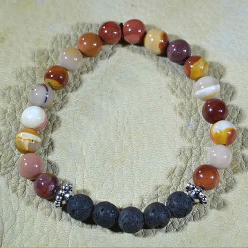 This mookite aromatherapy bracelet is handcrafted using multicolored mookite gemstones and smooth lava stones. Colors range from pinks to golds and reds in this beautiful stone. Enjoy the calming powers of nature and smell great too. Place a drop of your favorite essential oil directly onto the lava stones and allow it soak in. Lava stones are rich in minerals and very porous.