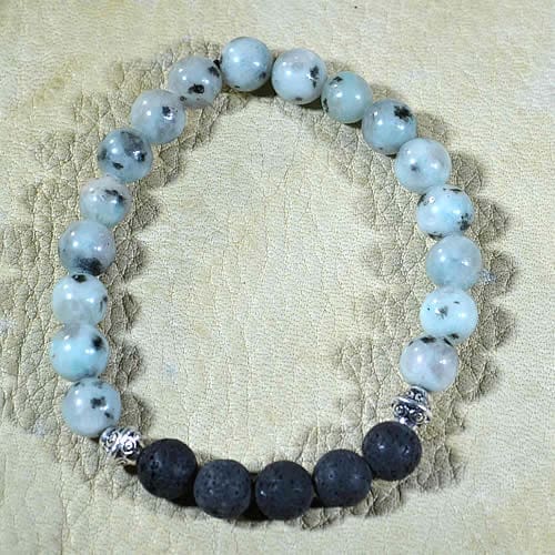 This sesame jasper aromatherapy bracelet is handcrafted using light colored gloss finished sesame jasper gemstones and all natural lava stones. Enjoy the beneficial powers of nature and smell great too. Place a drop of your favorite essential oil directly onto the lava stones and allow it soak in. Lava stones are very porous and rich in minerals.