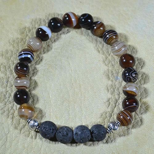 This striped agate aromatherapy bracelet is made using beautiful rich brown and tan colored striped agate gemstones and smooth lava stones. Place a drop of your favorite essential oil directly onto the lava stones and allow it soak in. Lava stones are rich in minerals and very porous. Enjoy the beneficial powers of nature and smell great too.